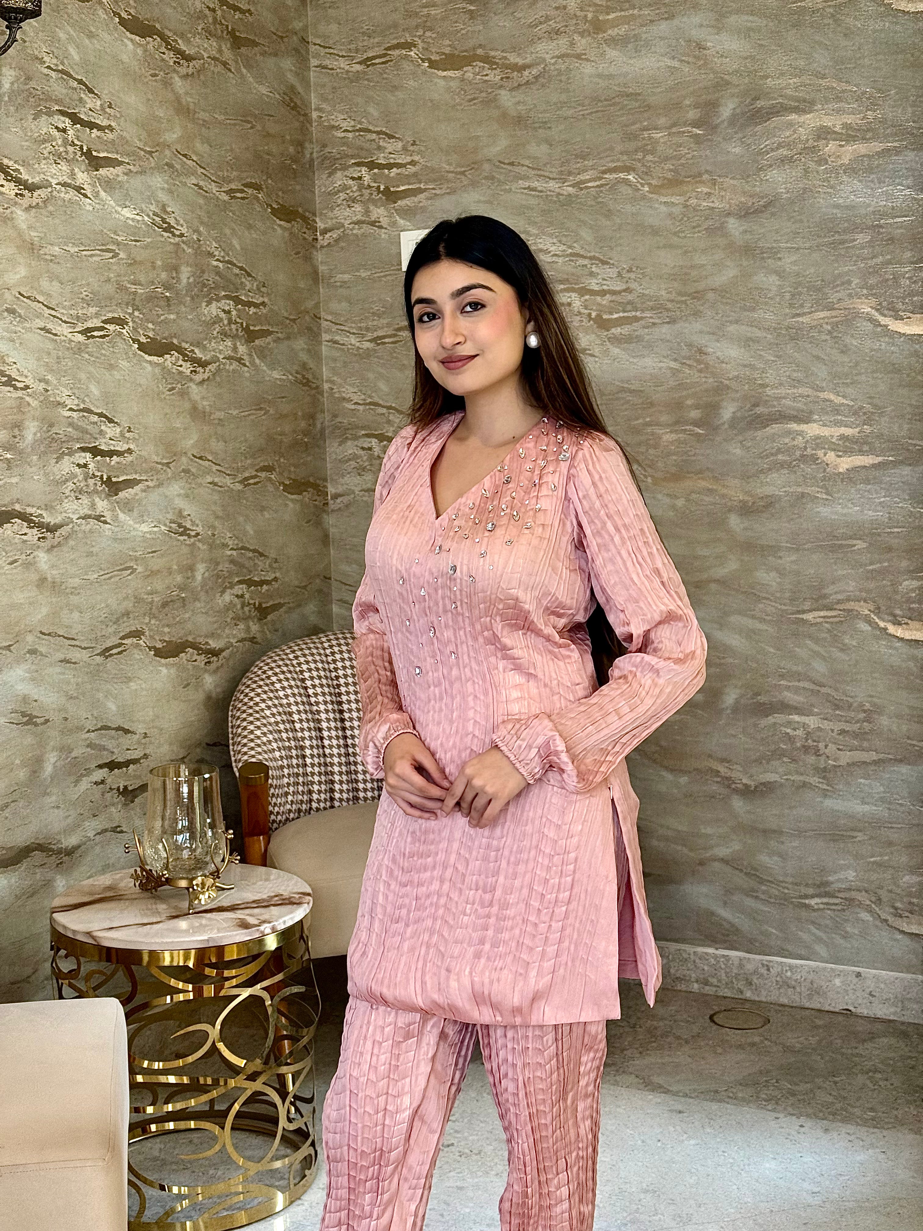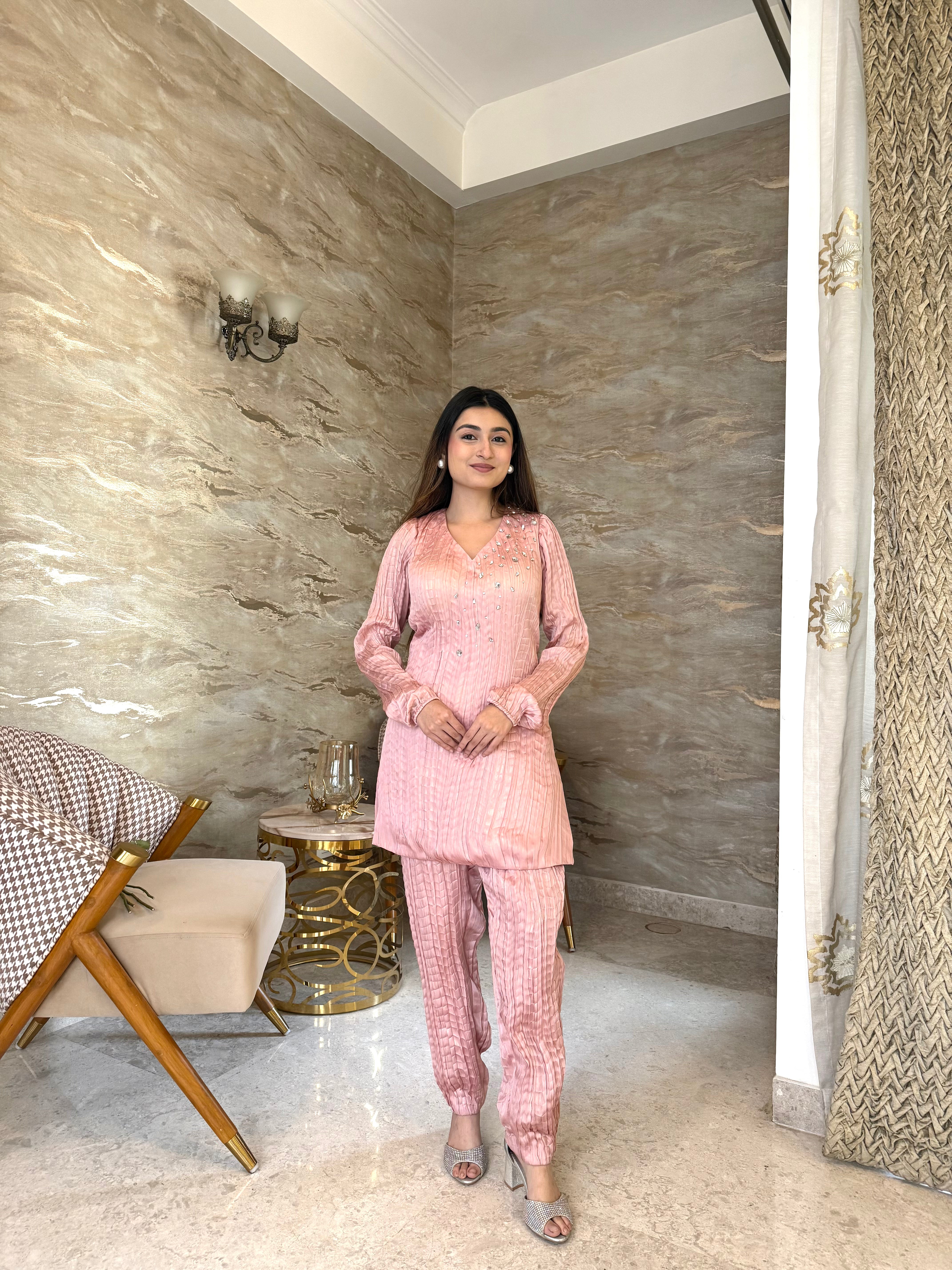 Step into effortless elegance with our blush-toned crushed georgette tissue satin co-ord set—a dreamy fusion of subtle shine, luxe texture, and modern simplicity. This two-piece ensemble features a flattering V-neck kurta with full sleeves, crafted in a beautifully crushed satin blend that drapes like liquid light.